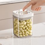 Airtight kitchen storage jar for dry foods. Easy press-to-close design, perfect for pantry organization.